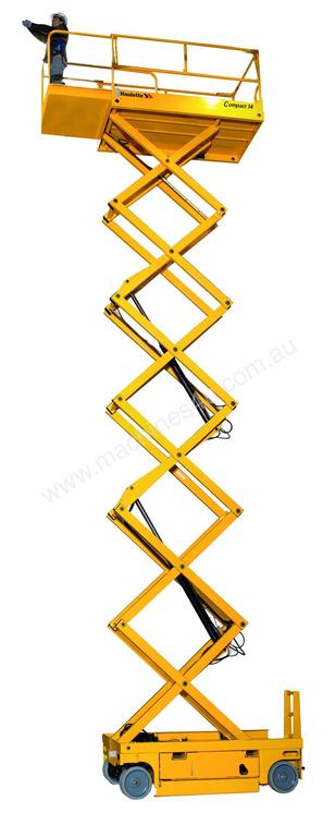 Haulotte Compact 14 electric scissor lift for sale providing a platform capacity of 350 kg with a maximum working height of 13.8 m and a platform height of 11.8 m.