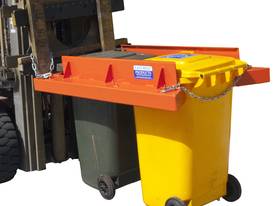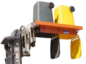 Wheelie bin lifter and tipper telehandler attachment for hire has been designed to safely and easily lift and rotate either one or two 240 litre wheelie bins. Emptying is simply carried out using a telehandler with a rotator attachment. To provide safety to operators and site personnel, a safety chain prevents unintentional disengagement of a wheelie bin from the attachment during transport or rotation.