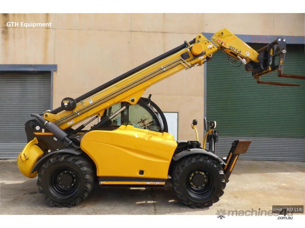 The Haulotte HTL 4014 telehandler has a maximum lift capacity of 4000 kg and a maximum lift height of 13.6 metres with an overall length of 6.46 metres stowed, a width of 2.43 metres, a height of 2.60 metres, weighing in at 10.710 kg.